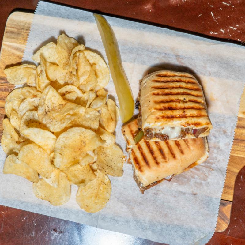 Steak, grilled onions & jalapeno, garlic mayo, provolone cheese on a rustic bun